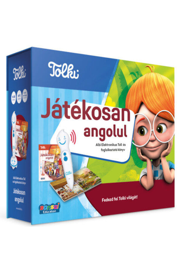 A szettben található Játékosan angulul című könyv kiváló nyelvtanulási lehetőség kezdőknek és középhaladóknak. Könnyed módon nyújt segítséget a szókincs fejlesztésében és a helyes kiejtés elsajátításában. A könyv angol anyanyelvű narrátorokkal készült, de tartalmaz magyar nyelvű fordításokat is. Három különböző nehézségű kvízsorozat segít a tanultak ellenőrzésében. A könyv realisztikus rajzokkal és humoros szövegekkel teszi érdekessé a hétköznapi élethelyzetekhez, tevékenységekhez, évszakokhoz tartozó tematizált oldalak böngészését és az aktív tanulást. A szett tartalmazza a könyvben szereplő ábrákhoz elektronikusan rögzített szövegek felolvasására szolgáló eszközt, és az annak feltöltéséhez szolgáló elektromos töltő berendezést is.
